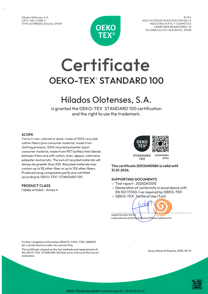 HILOSA creates an ecological yarn, recycled using a unique manufacturing system which provides hight performance and benefits. Our system guarantees maximum sustainability of the manufacturing process, with the best ecological certifications.